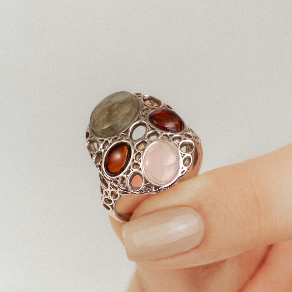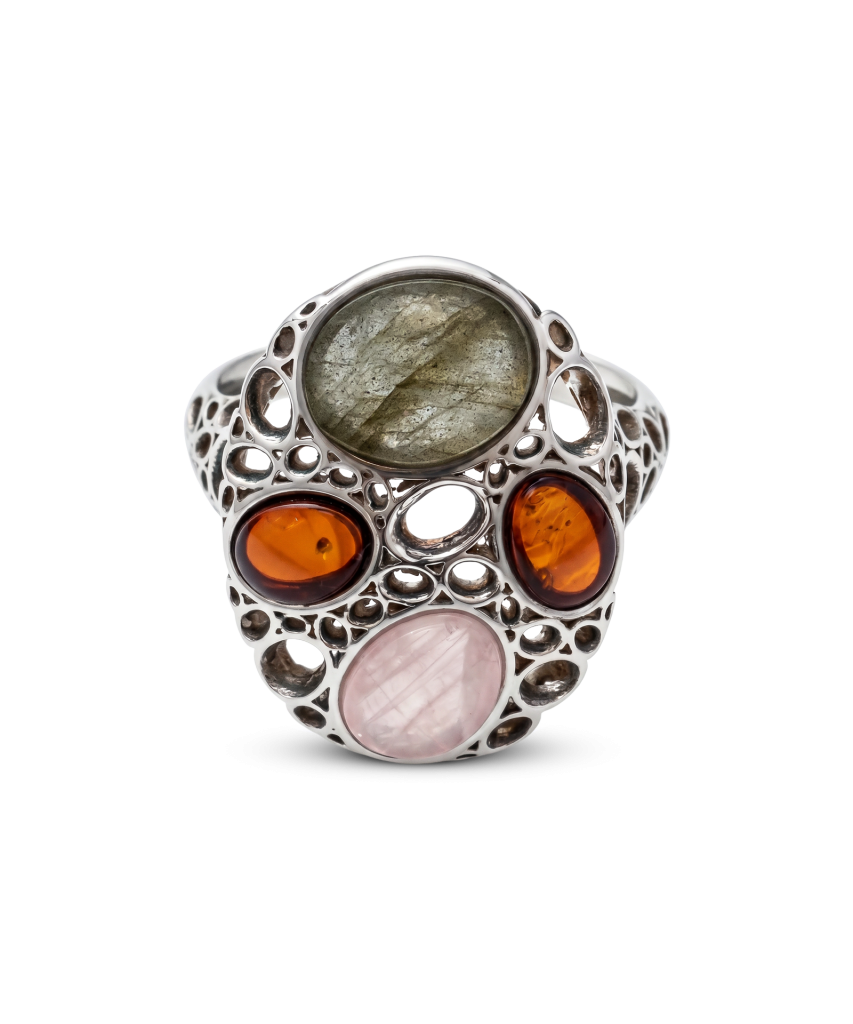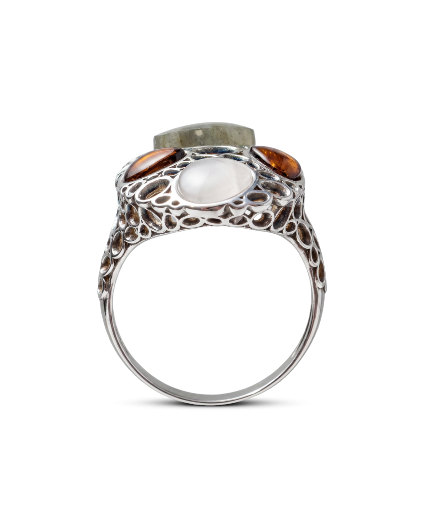 Sudraba gredzens ar dzintaru un labradorītu