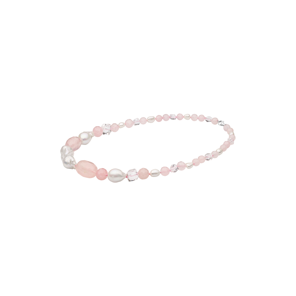 Kaklarota ar rožu kvarcu, pērlēm, kristālu un sudrabu