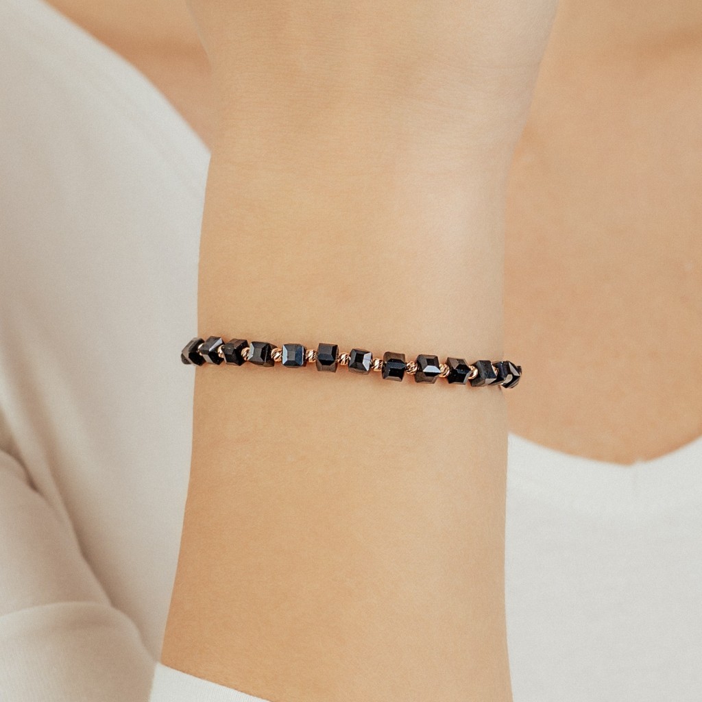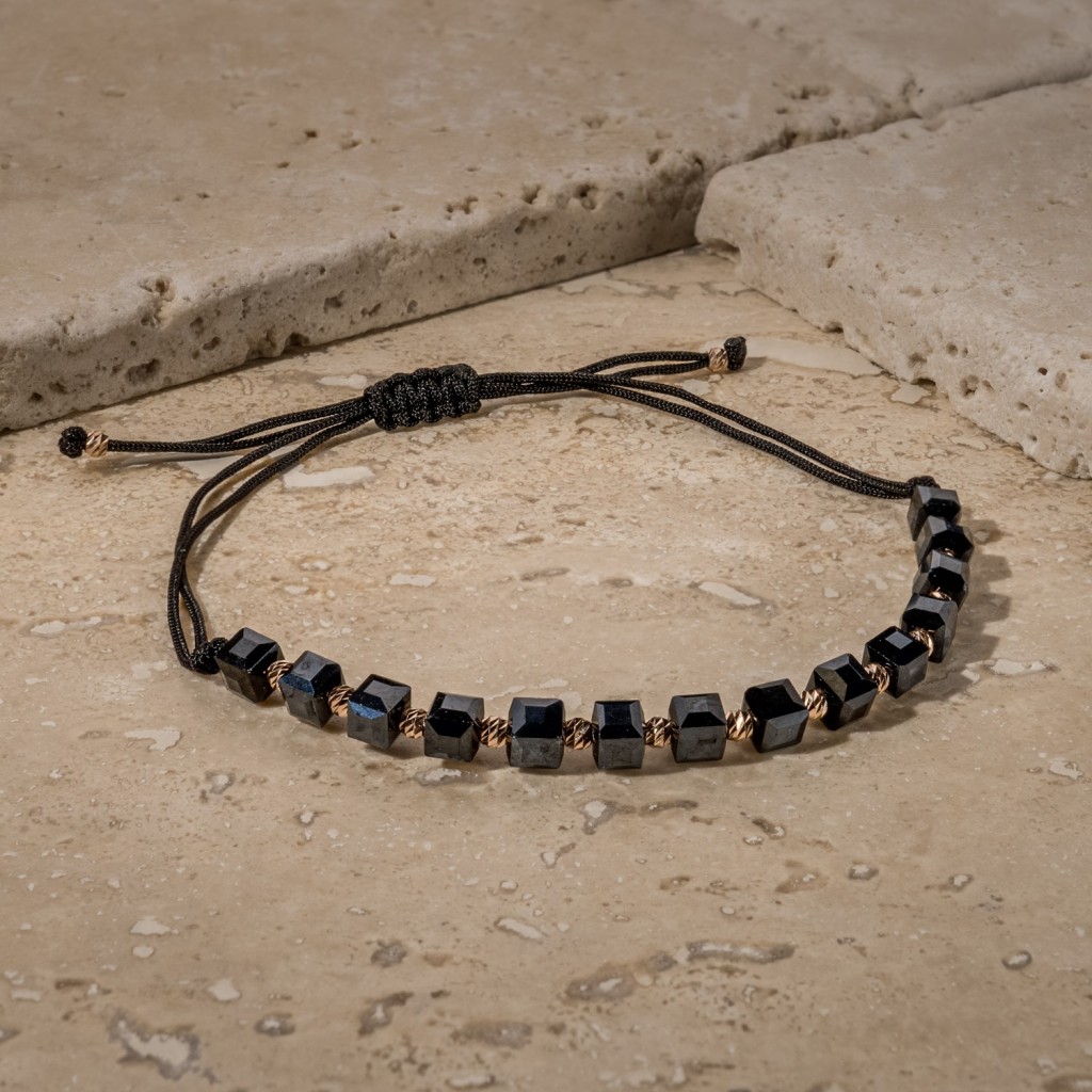 Браслет из черной нити с золотом и гематитами
