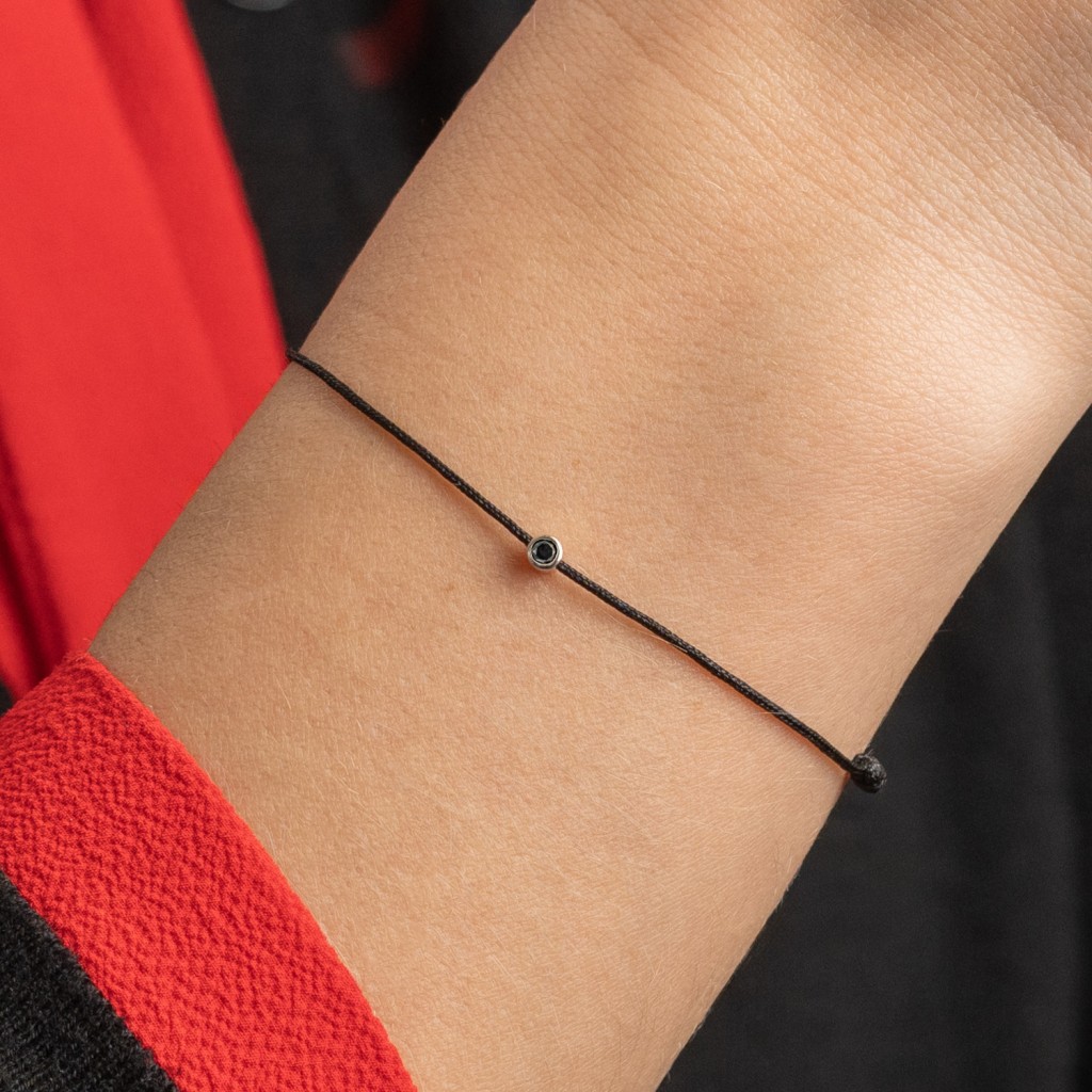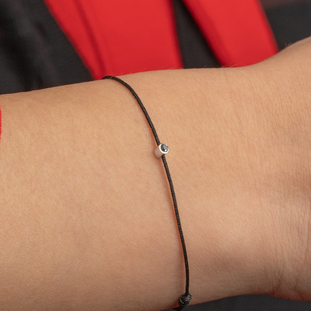 Браслет на чёрной нити с чёрным бриллиантом и белым золотом