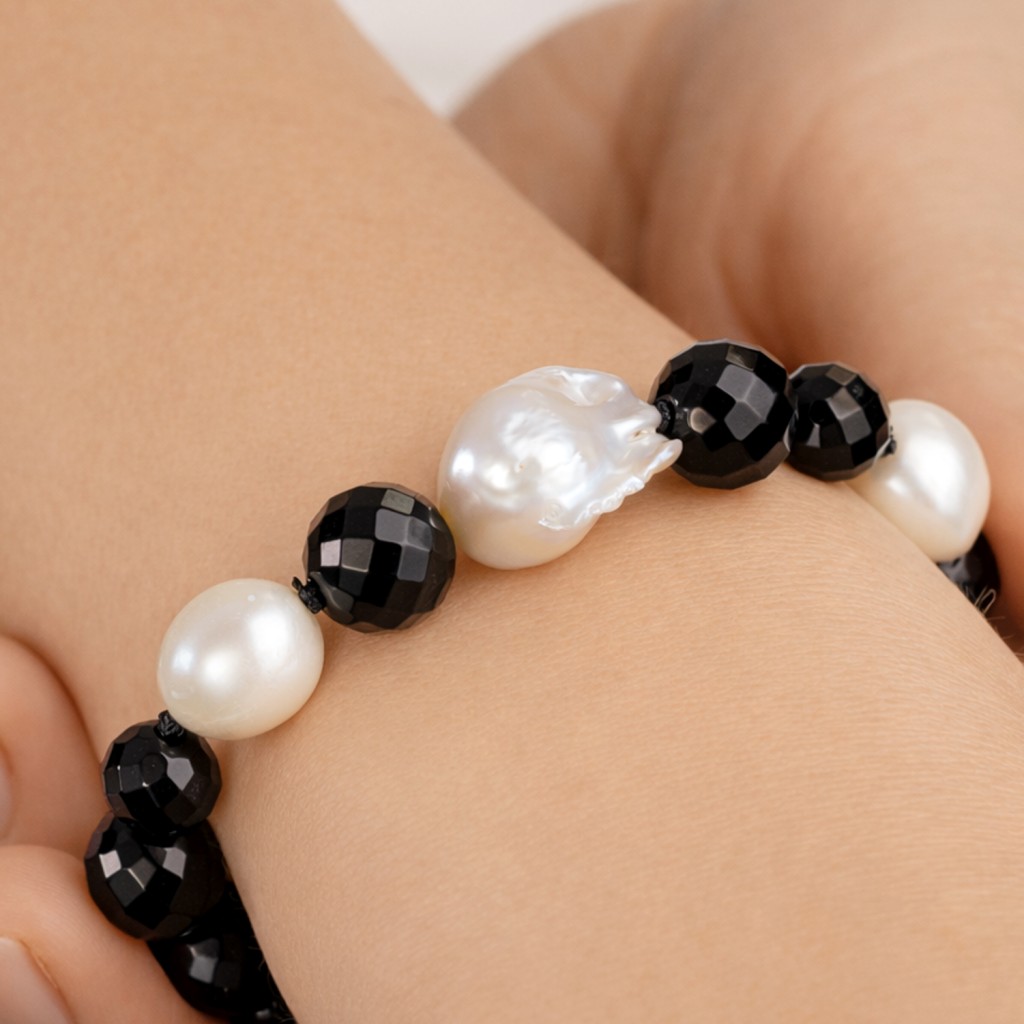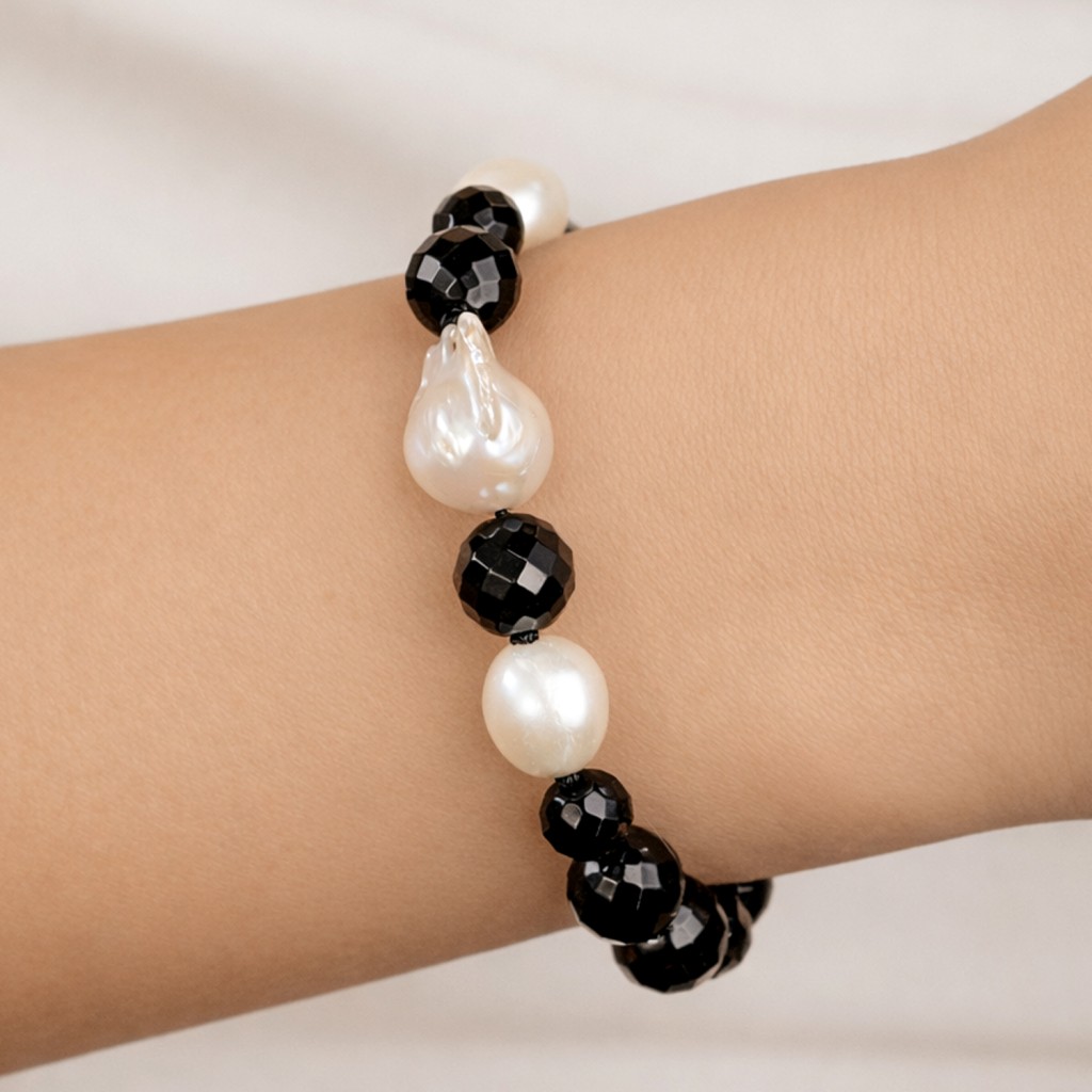 Браслет из оникса с жемчугом Касуми и серебром